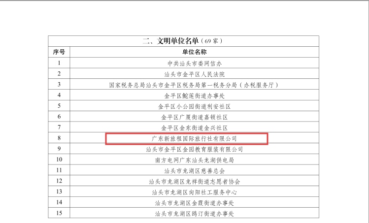新風(fēng)蕩漾千般秀,文明花開別樣紅。榮譽(yù)是一份鼓勵(lì),是一份動(dòng)力,更是一份堅(jiān)守和責(zé)任,廣東新旅程國際旅行社有限公司將再接再厲,積極創(chuàng)新,以更高的標(biāo)準(zhǔn)、更新的形式、更實(shí)的舉措,積極推行旅游企業(yè)建立“首席質(zhì)量官”“標(biāo)桿服務(wù)員”制度的建設(shè),以高質(zhì)量服務(wù)助力汕頭市高質(zhì)量發(fā)展!為精神文明創(chuàng)建工作注入強(qiáng)勁動(dòng)力。新風(fēng)蕩漾千般秀,文明花開別樣紅。榮譽(yù)是一份鼓勵(lì),是一份動(dòng)力,更是一份堅(jiān)守和責(zé)任,廣東新旅程國際旅行社有限公司將再接再厲,積極創(chuàng)新,以更高的標(biāo)準(zhǔn)、更新的形式、更實(shí)的舉措,積極推行旅游企業(yè)建立“首席質(zhì)量官”“標(biāo)桿服務(wù)員”制度的建設(shè),以高質(zhì)量服務(wù)助力汕頭市高質(zhì)量發(fā)展!為精神文明創(chuàng)建工作注入強(qiáng)勁動(dòng)力。